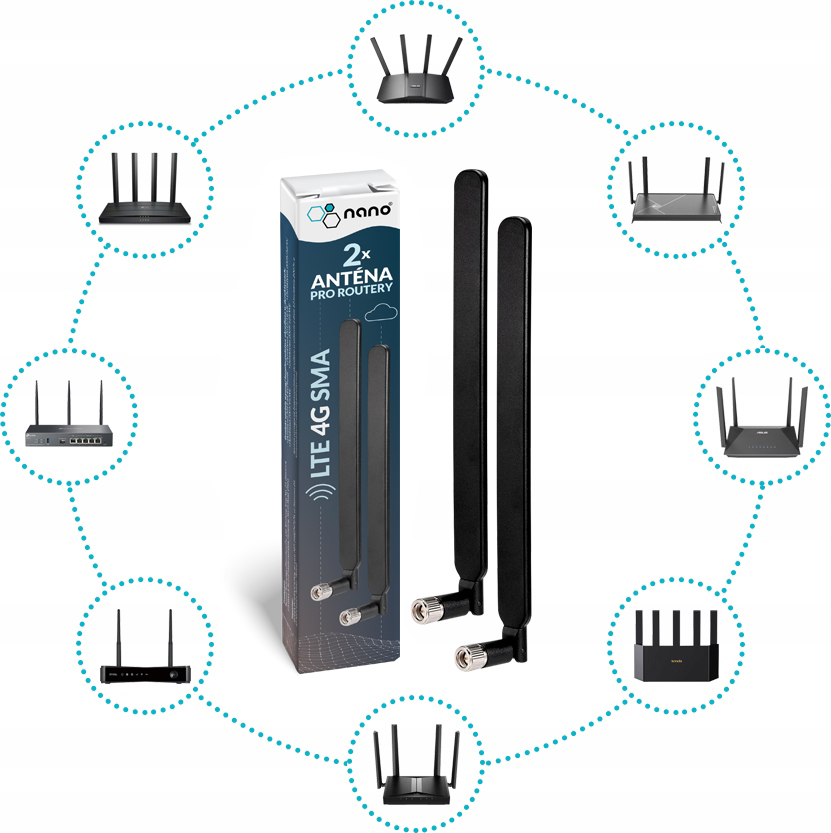 Anténa je kompatibilní s mnoha LTE routery s konektorem SMA, takže:
