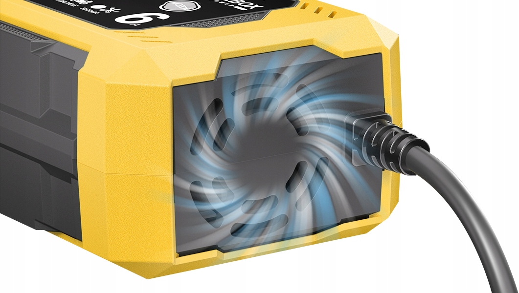 Nabíječka je vybavena vestavěným chladicím ventilátorem, který zajišťuje udržení správné provozní teploty během práce. Díky aktivnímu chlazení může zařízení pracovat stabilně i při delším nabíjení, bez rizika přehřátí.