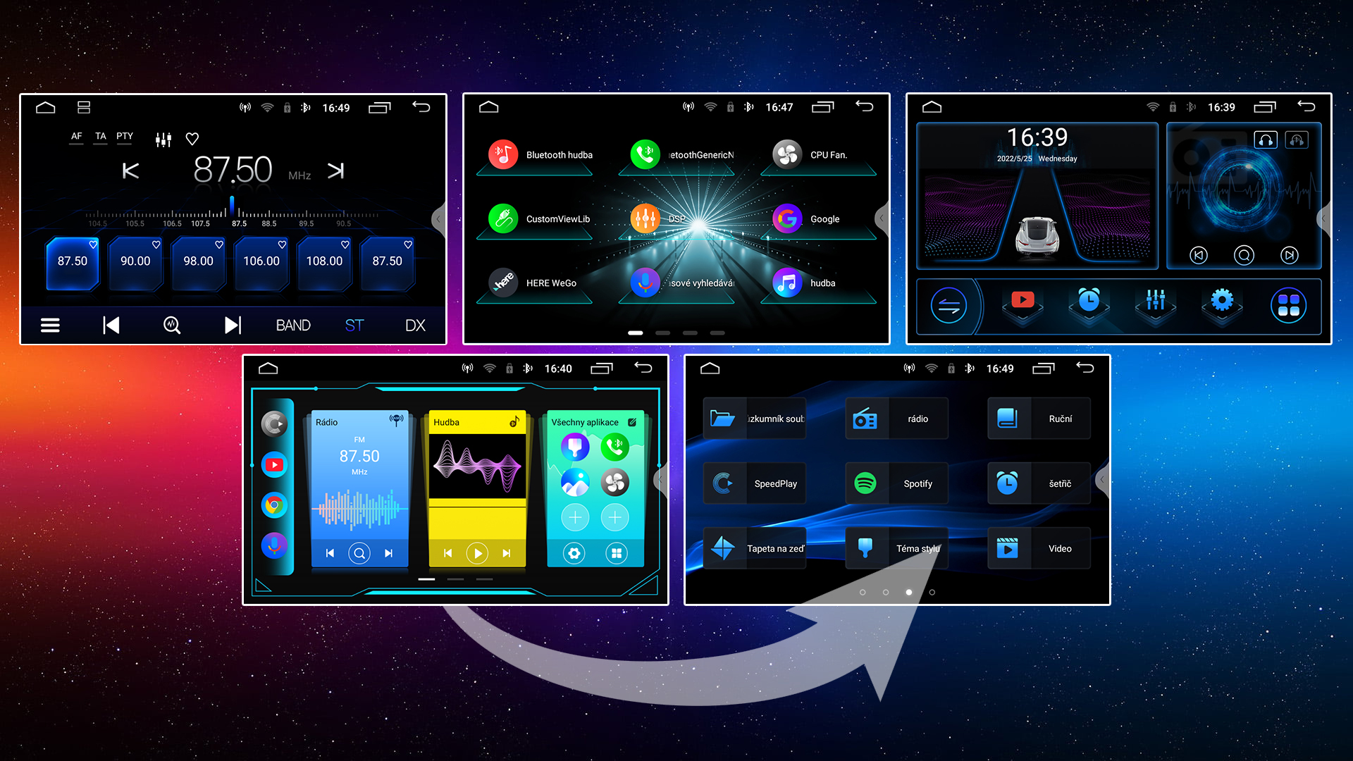 Nejnovější verze Androidu umožňuje až 18 možností vzhledu nabídky pro vlastní přizpůsobení. Možnost kdykoli změnit design v závislosti na vaší náladě! Přizpůsobte vzhled rozhraní interiéru vašeho vozu.