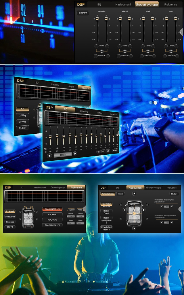 Zařízení umožňuje nastavit zpoždění pro každý z reproduktorů a upravit zesílení signálů do jednotlivých reproduktorových sekcí. Navíc si můžete nastavit zvuk v rozsahu od 20Hz do 20kHz s oktávovým boostem 6/12/24/36/48 db.