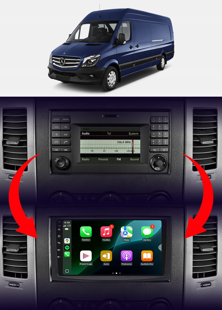 Rádio určené a plně přizpůsobené pro provoz ve vozidle Mercedes-Benz Sprinter W906 2006-2019