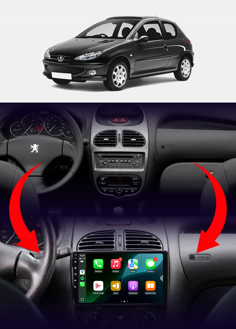 Rádio určené a plně přizpůsobené pro provoz ve vozidle PEUGEOT 206 206CC 2002-2010