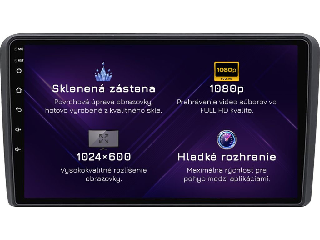 ⚠️ Rozlišení: 1024px x 600px = širokoúhlý Super VGA. Nejběžnější zobrazovací standard pro špičková rádia. Filmy se přehrávají v HD kvalitě.