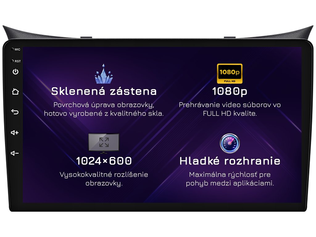 ⚠️ Rozlišení: 1024px x 600px = širokoúhlý Super VGA. Nejběžnější zobrazovací standard pro špičková rádia. Filmy se přehrávají v HD kvalitě.