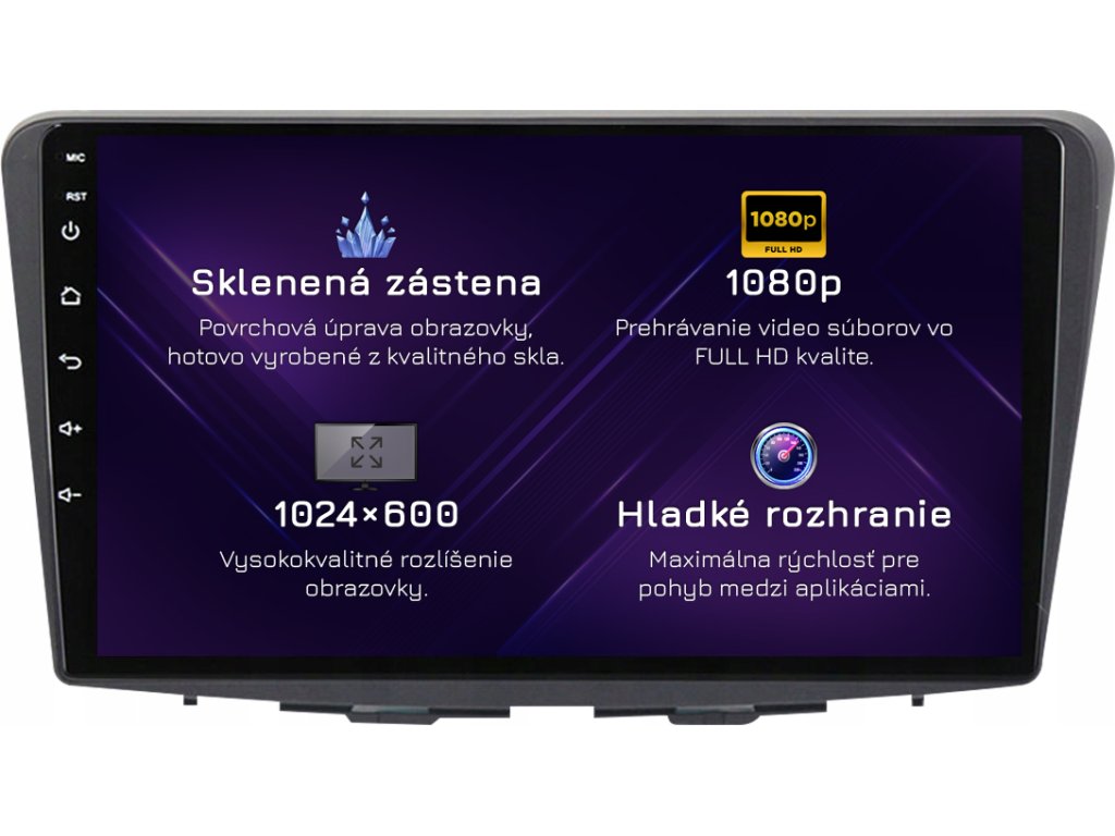 ⚠️ Rozlišení: 1024px x 600px = širokoúhlý Super VGA. Nejběžnější zobrazovací standard pro špičková rádia. Filmy se přehrávají v HD kvalitě.