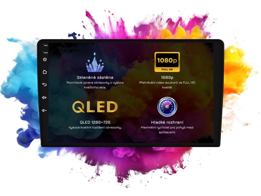 🖥️ Displej: 9″ QLED 1280×720 pokrytý tvrzeným sklem