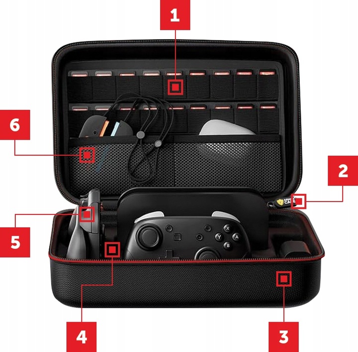 5️⃣ Dedikované kapsy na: konzoli, Joy-Cony, dokovací stanici, ovladač Switch 2 Pro Controller, nabíjecí držák, nabíječku, kabely a vodiče