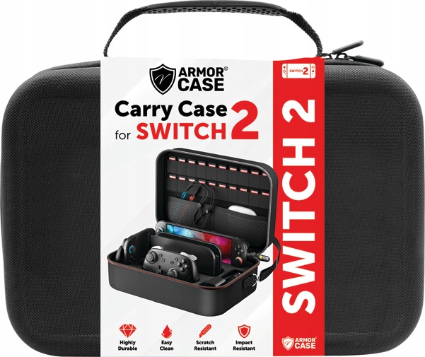 Obal je velmi odolný a dokonale chrání vaši konzoli i veškeré příslušenství – Dock, ovladače, Nintendo Switch 2 Pro Controller, Joy-Cony 2, nabíječku, napájecí a signální kabely, hry, sluchátka a mnoho dalšího – před mechanickým poškozením, otřesy, vlhkostí a prachem.