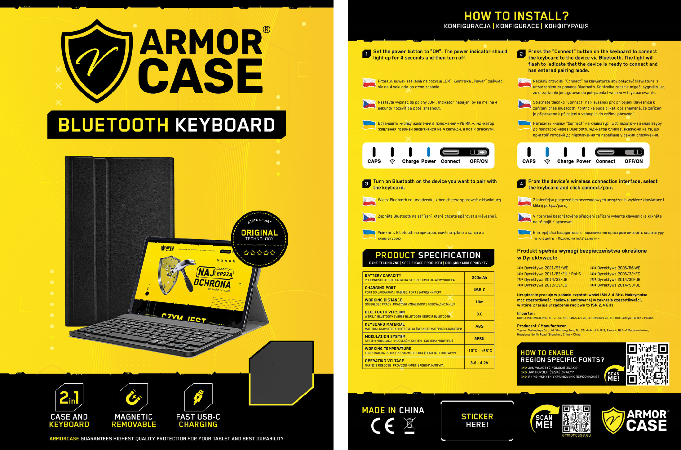 Pouzdro má vestavěný magnet, díky kterému je klávesnice připojena k pouzdru. Klávesnici lze kdykoli odpojit a pracovat ve větší vzdálenosti od tabletu