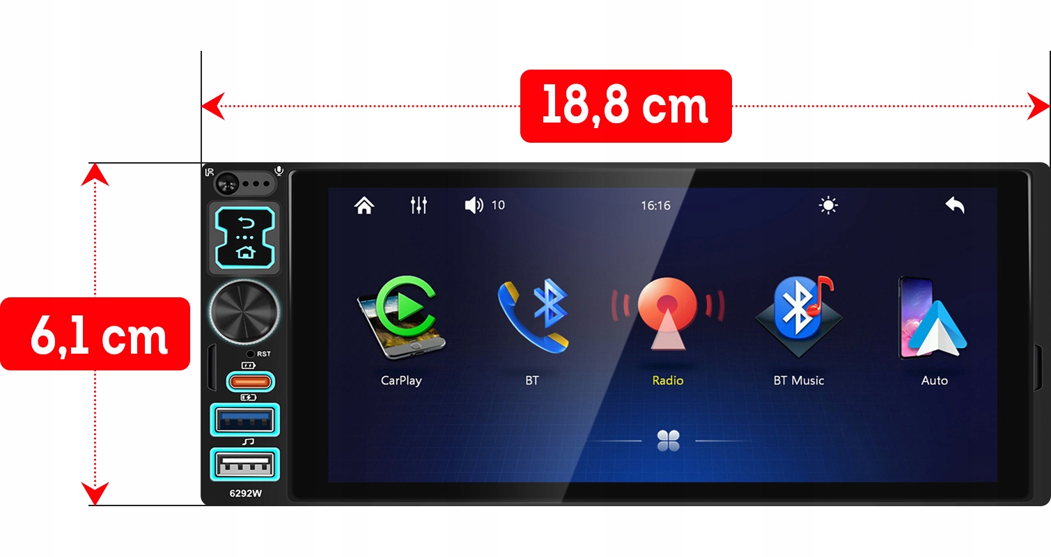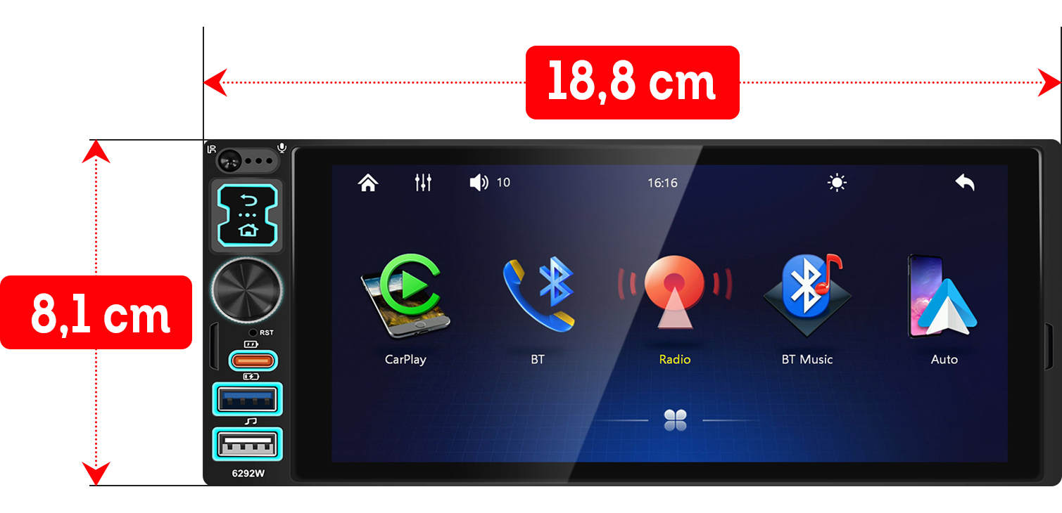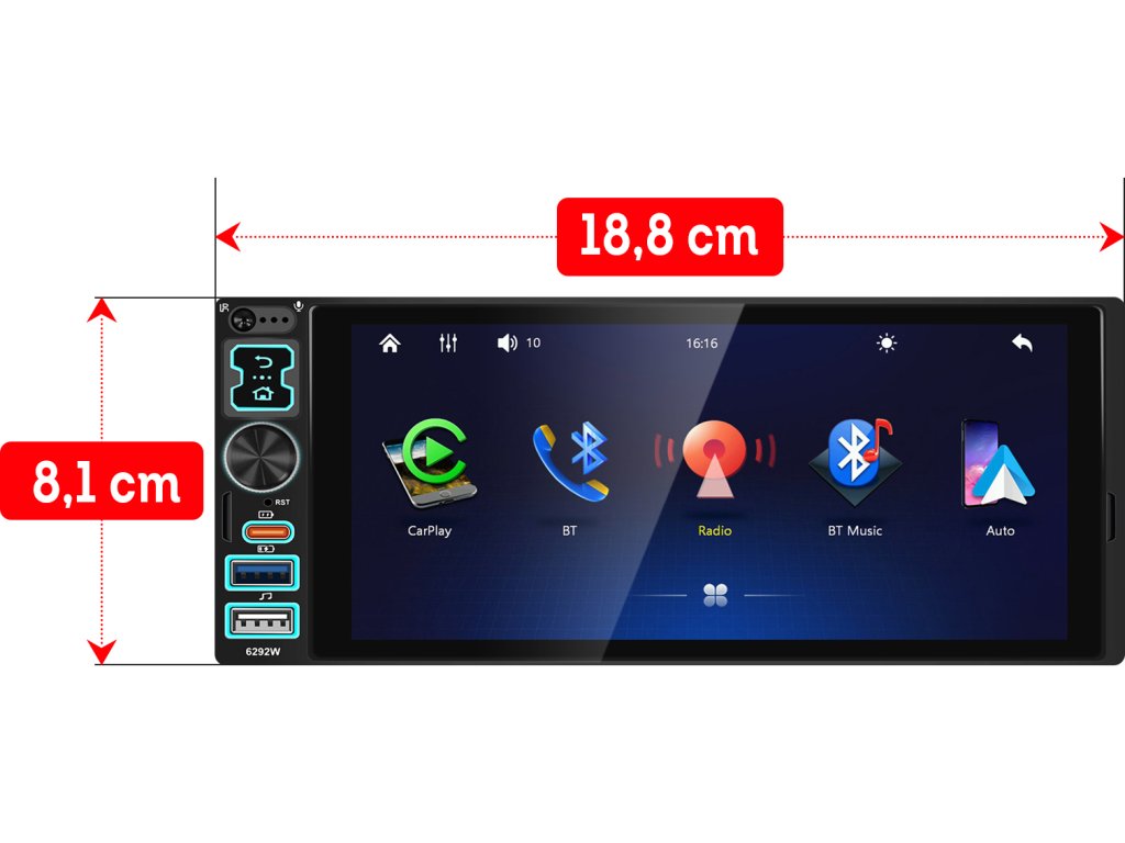Zařízení pasuje do otvoru 1DIN, avšak přední panel je mírně větší.