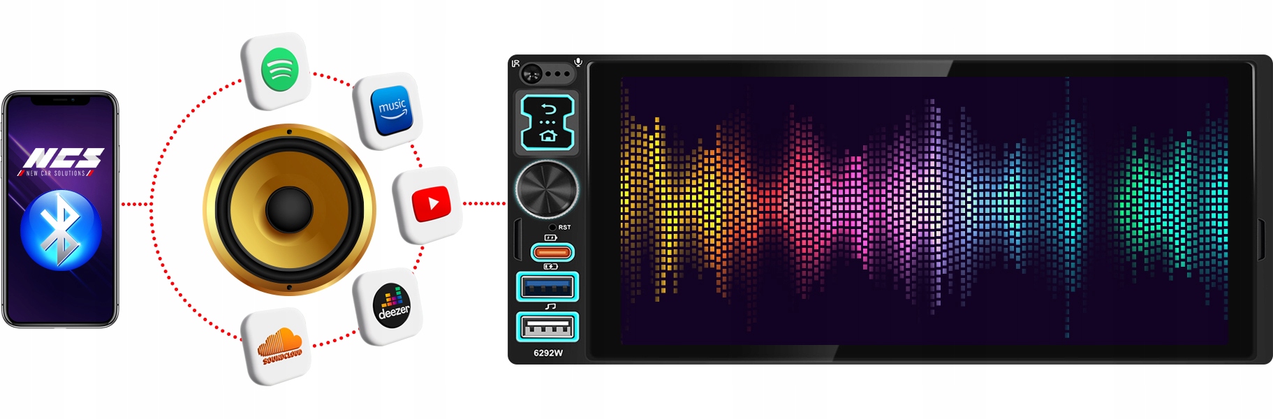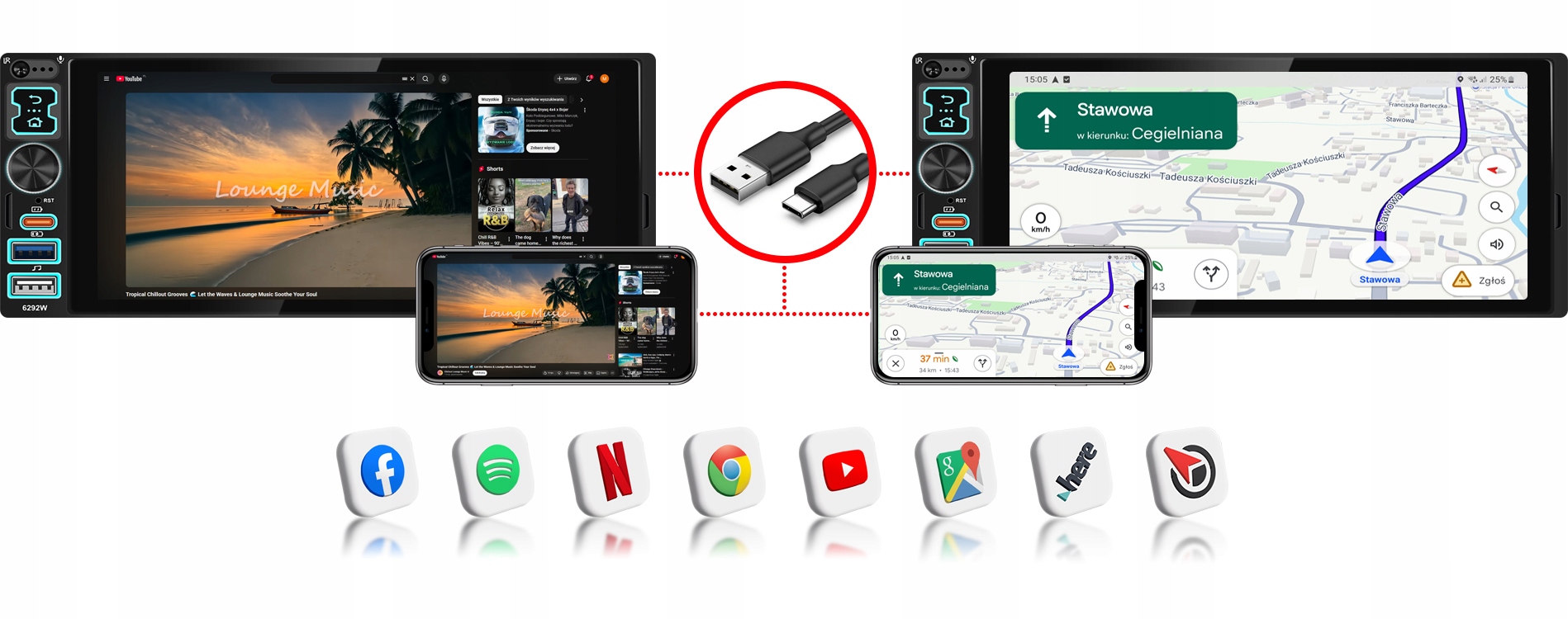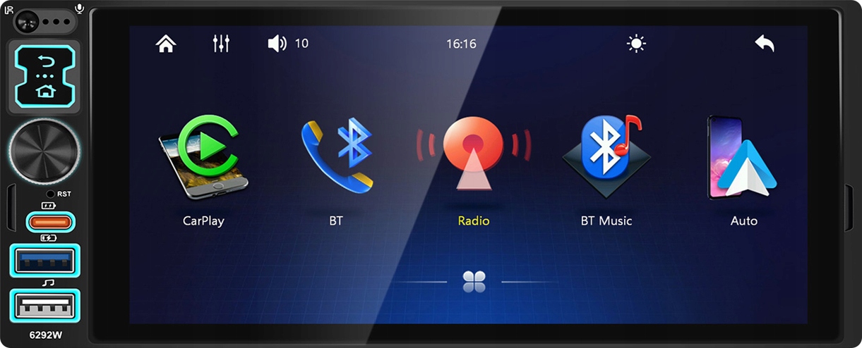 Díky třem USB portům (2× USB a 1× USB-C) můžete současně nabíjet dva telefony a zároveň používat USB flash disk. Rádio lze také připojit k telefonu kabelem a využívat Apple CarPlay nebo Android Auto – telefon se při kabelovém připojení nebude vybíjet tak rychle jako při bezdrátovém spojení.