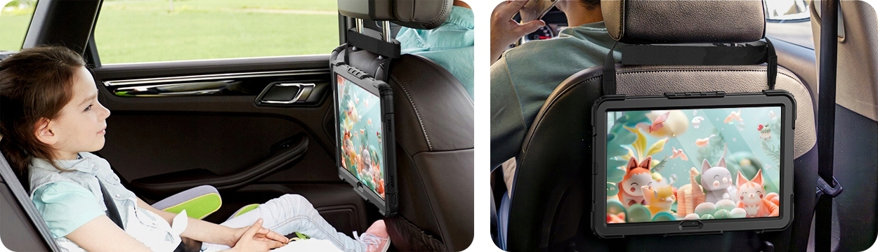 Díky popruhu na opěrku hlavy je tablet bezpečně připevněn a vaše dítě může v klidu sledovat své oblíbené pohádky v autě. Pohodlná cesta bez nutnosti držet zařízení v rukou!