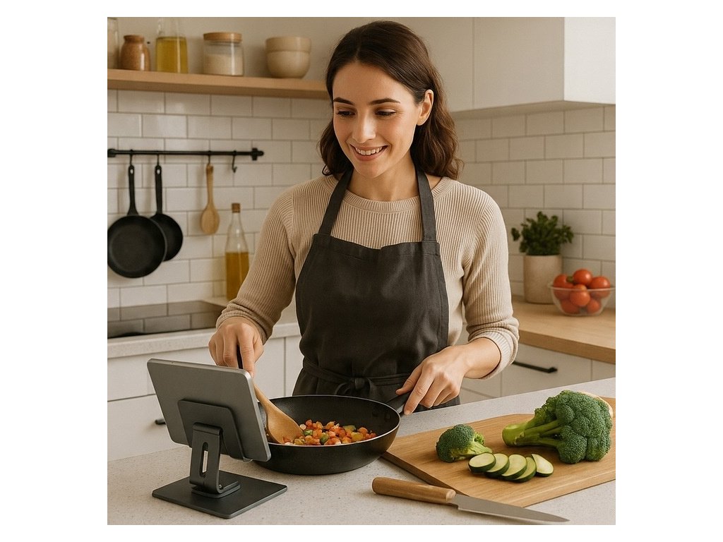 Díky stojanu můžeš tablet umístit kamkoli a sledovat videa, recepty, vést videohovory nebo ho používat jako referenční obrazovku při práci – a to vše bez nutnosti držení v ruce!