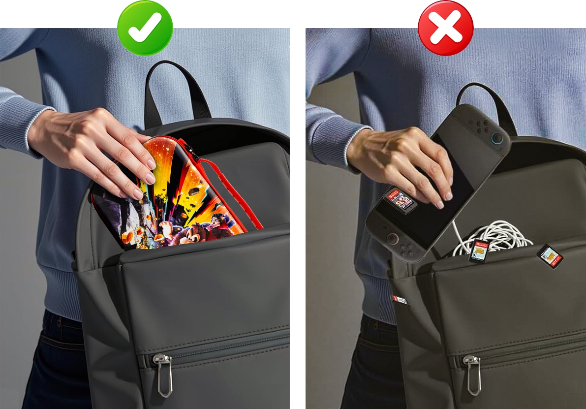 Díky preciznímu přizpůsobení a vysoce kvalitním materiálům pouzdro dokonale přiléhá ke konzoli, aniž by omezovalo přístup k portům nebo tlačítkům. Měkké vnitřní polstrování chrání displej i Joy-Cony a praktické přihrádky umožňují vzít si s sebou oblíbené hry – ideální řešení na každou cestu i každé banánové dobrodružství.