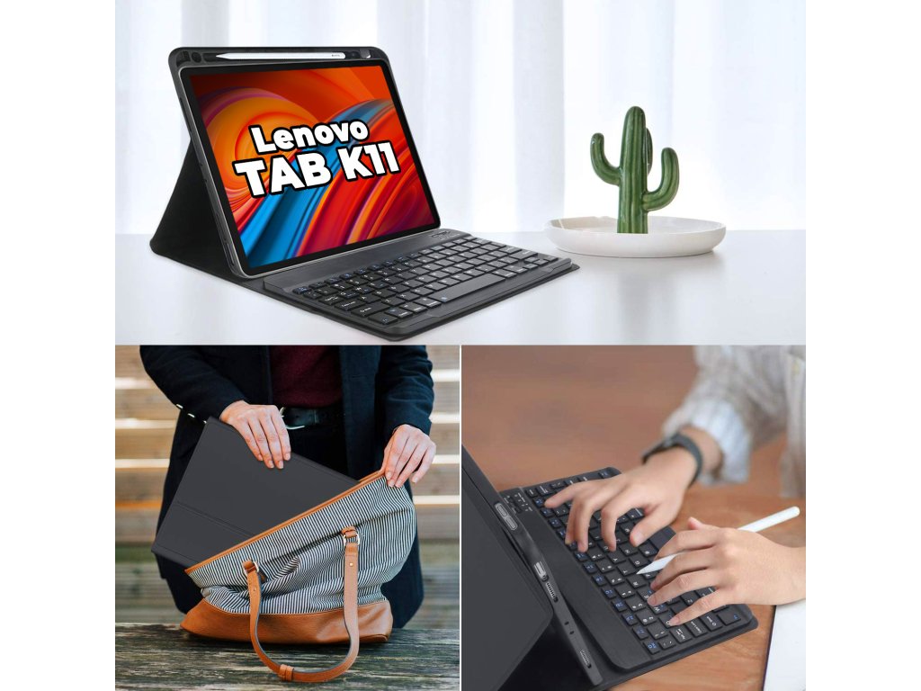 Nové speciální pouzdro s bezdrátovou klávesnicí pro tablet Lenovo Tab K11 11" 2024. Vyrobeno z vysoce kvalitních odolných materiálů. Je vybaveno výřezy pro všechny sloty, konektory, tlačítka a kamery. Pouzdro je lehké, ale odolné, vypadá esteticky a dokonale chrání tablet před mechanickým poškozením, vodou a prachem. Má praktické magnetické zapínání, které zabrání vypadnutí tabletu.