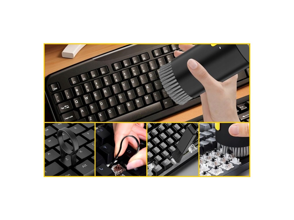 ☝️ Použij nástroj na vyjímání kláves, abys zjistil, co se skrývá uvnitř tvé klávesnice, a odstraň nahromaděné drobky pomocí velkého štětce nebo kartáčku ze sady.