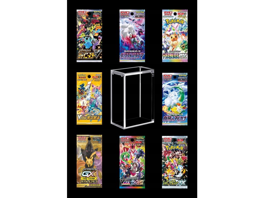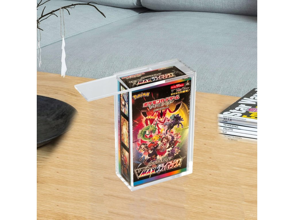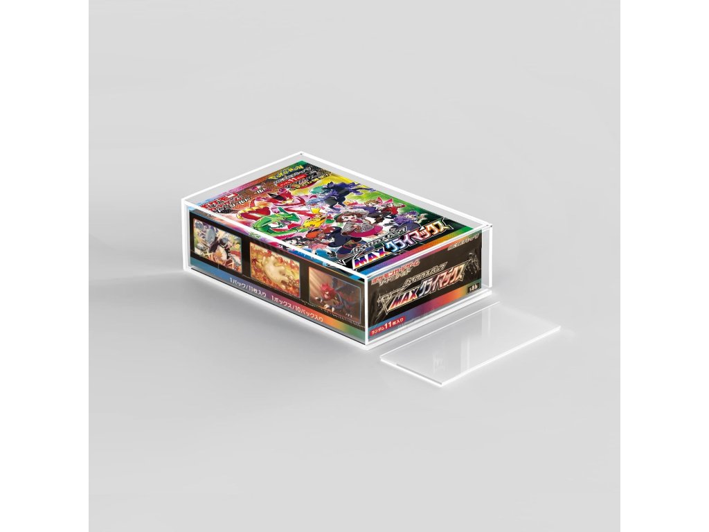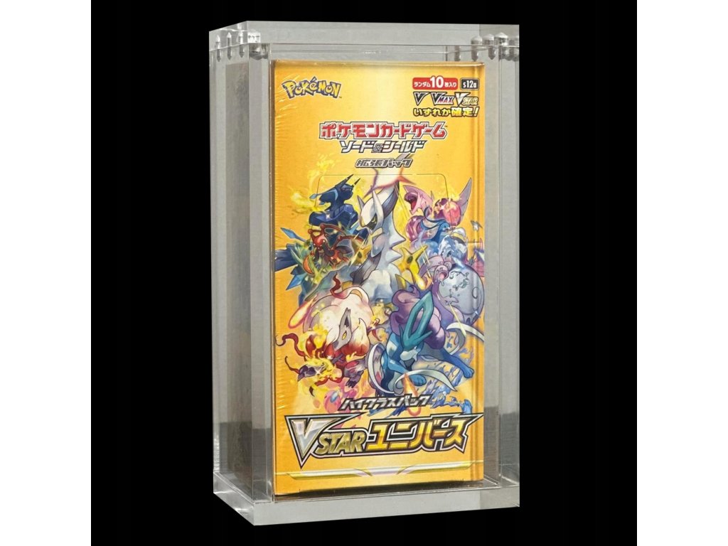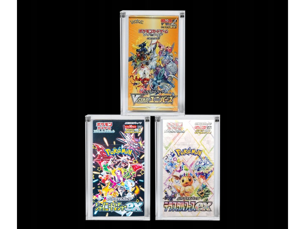 Exkluzivní průhledná akrylová vitrína navržená speciálně pro japonské sady Pokémon TCG Booster Box.