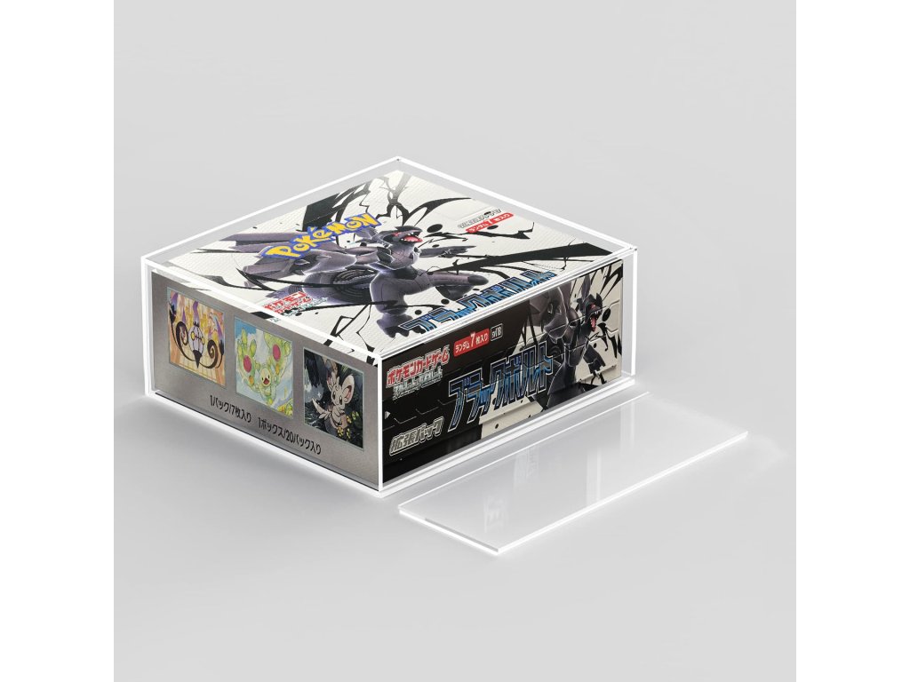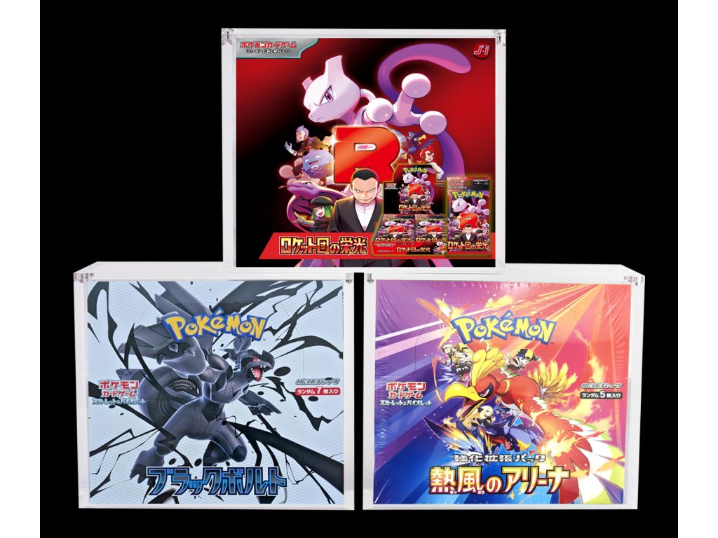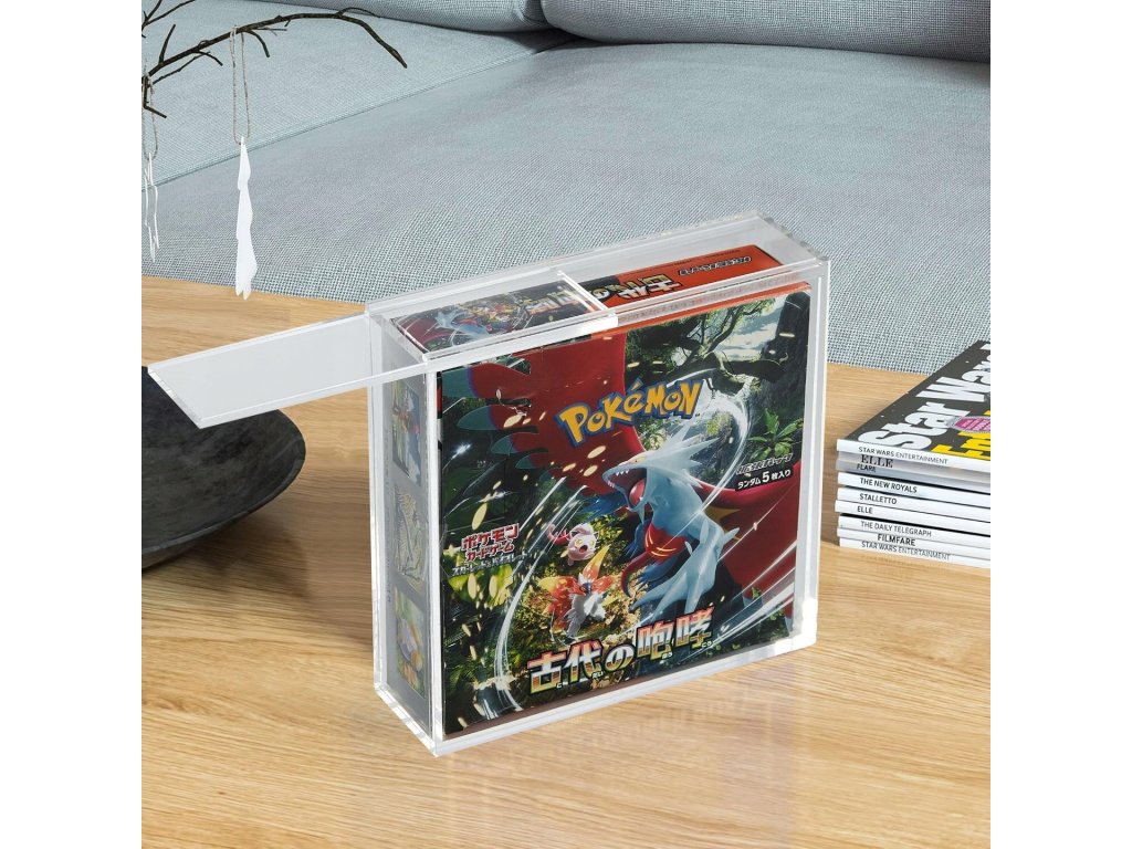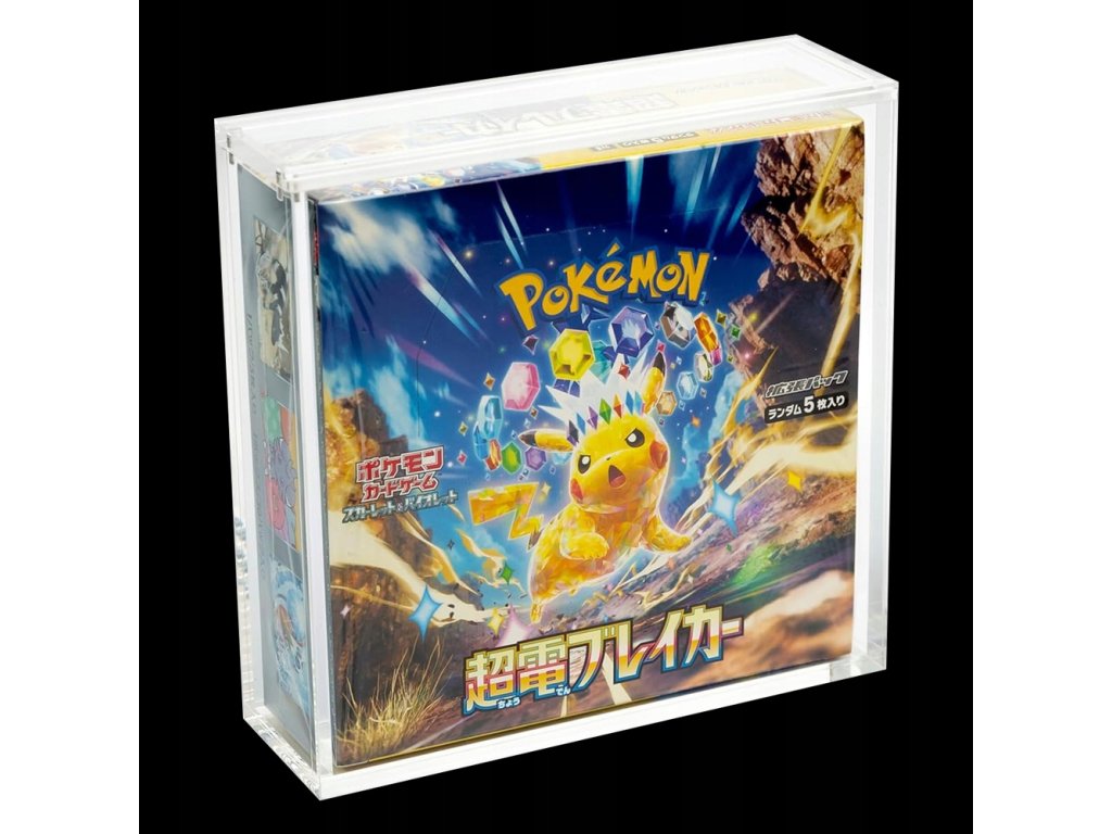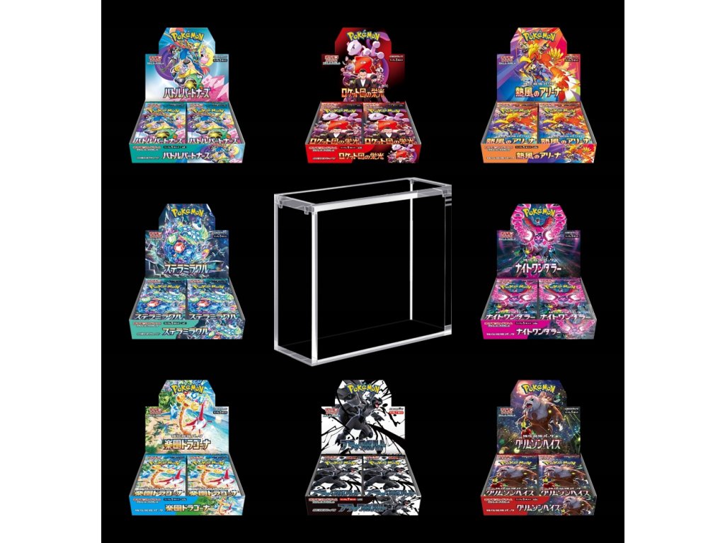 Exkluzivní průhledná akrylová vitrína navržená speciálně pro japonské sady Pokémon TCG Booster Box.